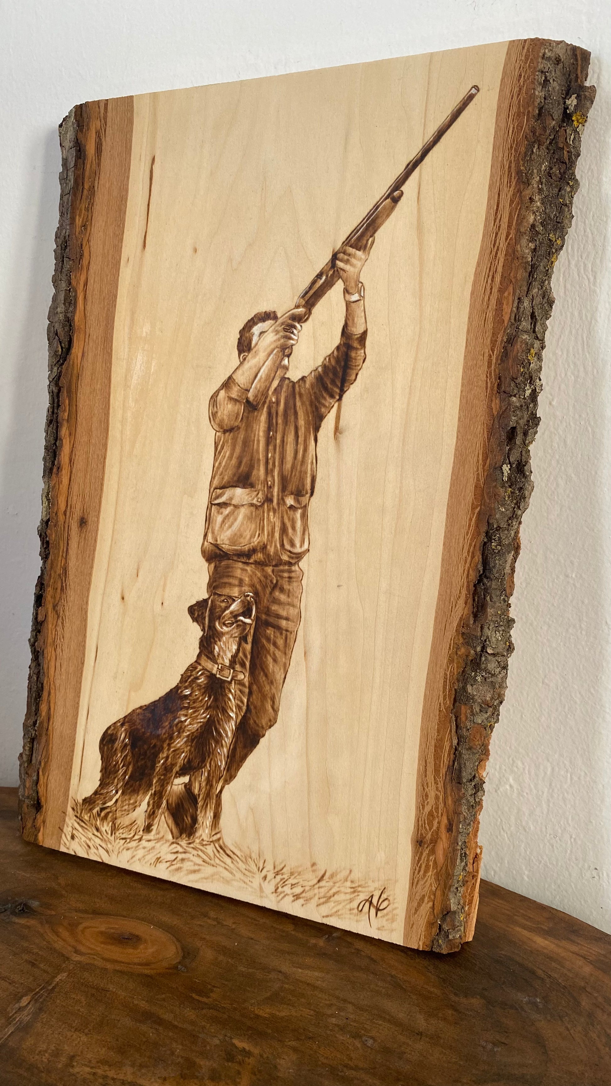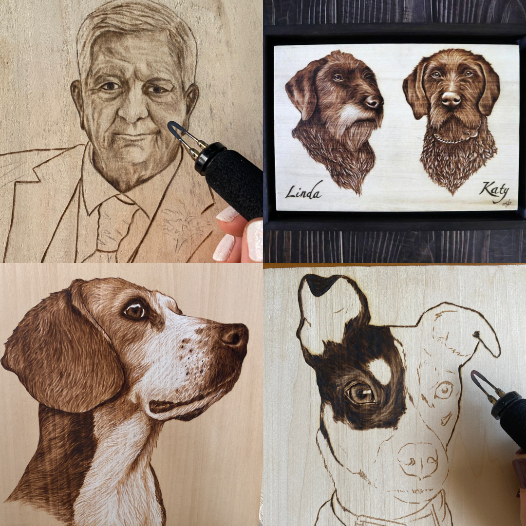 Convierte tu fotografía favorita en una obra de arte única. Cada retrato es realizado a mano con la técnica de pirograbado, donde el fuego graba cuidadosamente los detalles sobre la superficie de la madera.
